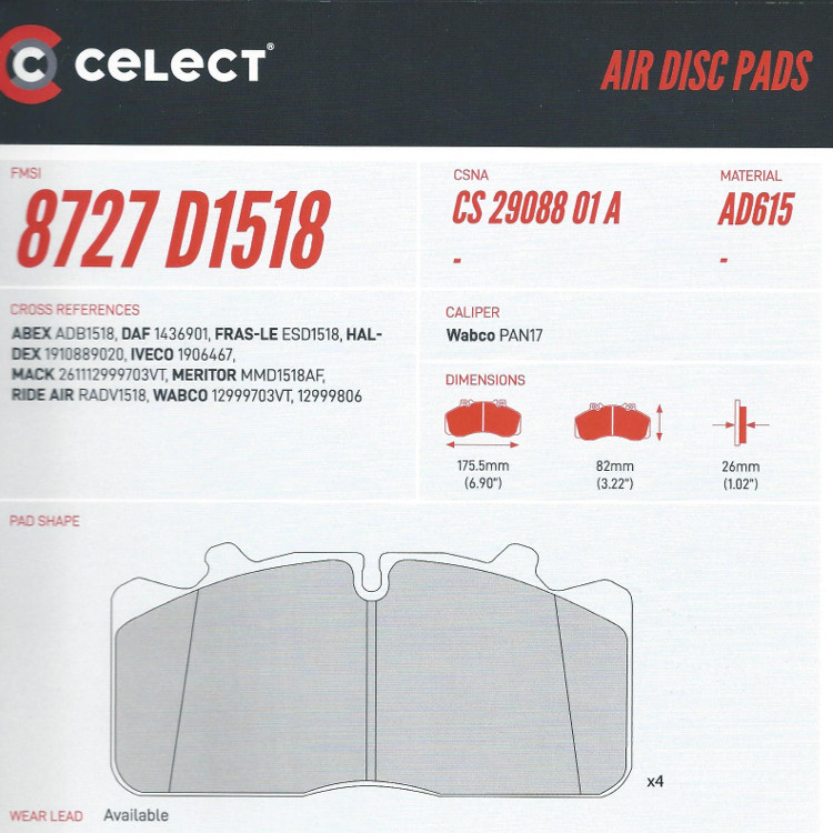 Celect CS2908801A Air Disc Brake Pads for Wabco PAN 17 Systems, D1518
